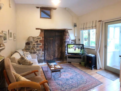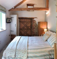 The bedroom is divided from the sitting room by an 18th century door. The room features exposed beams, a king size bed, wall mounted TV, plenty of storage and a
